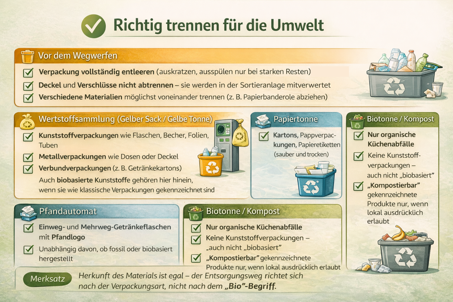 Bei der Entsorgung zählt weniger das „Bio“-Label als der tatsächliche Materialtyp. Gebrauchte biobasierte Flaschen und Verpackungen gehören in der Regel in den Pfandautomaten (bei Pfandware) oder in die Wertstoffsammlung wie Gelben Sack/Gelbe Tonne, nicht in die Biotonne. Nur so gelangen die Materialien in den mechanischen Recyclingkreislauf und können als Rezyklat wiederverwendet werden. Kompostierbare Produkte sind eine Ausnahme: sie benötigen oft industrielle Kompostierungsbedingungen und gehören deshalb nicht ohne Prüfung in den Hauskompost oder die Biotonne.