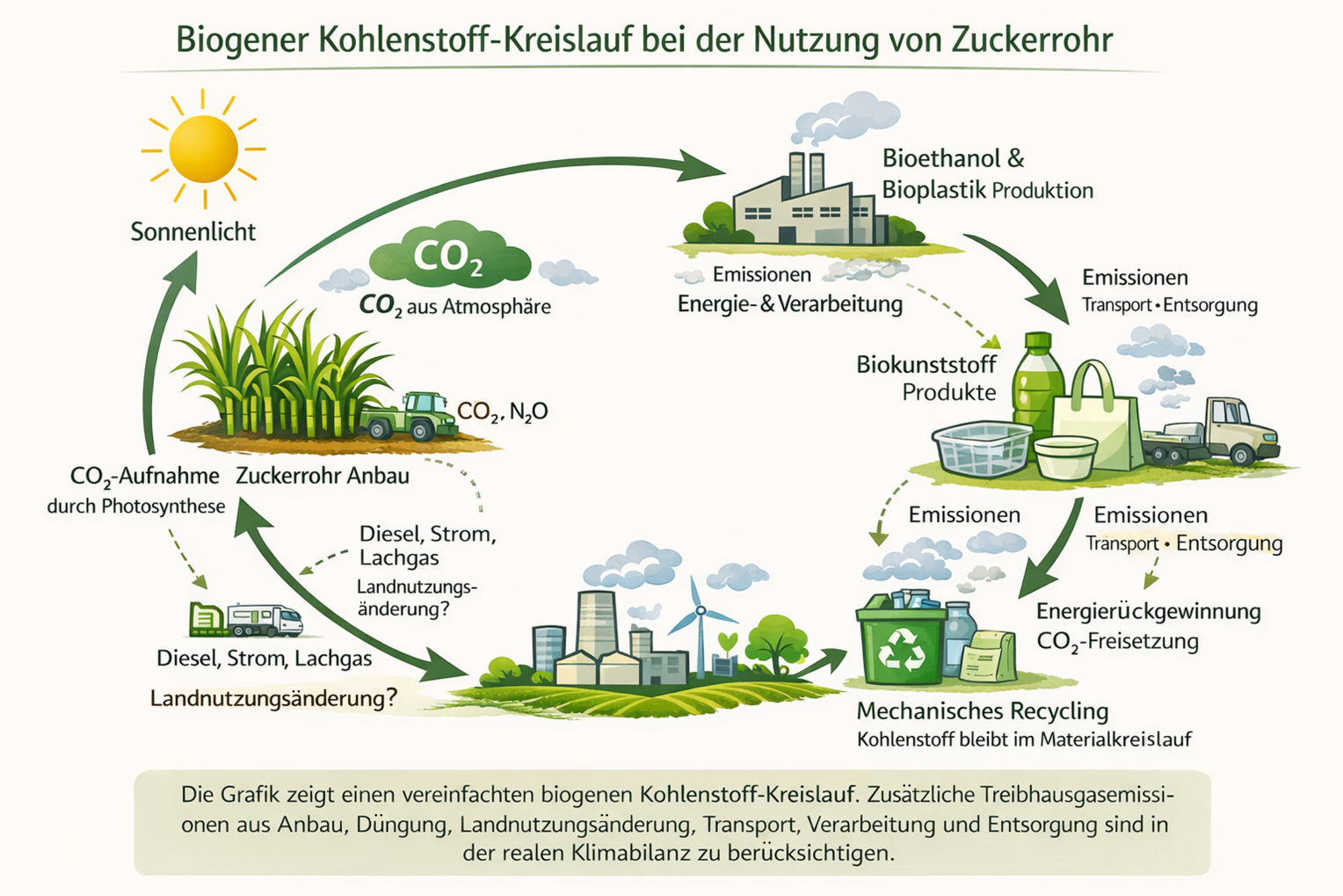 Zuckerrohr ist ein wichtiger Rohstoff für biobasierte Kunststoffe, weil die Pflanze während ihres Wachstums CO₂ aus der Atmosphäre aufnimmt und in Biomasse umwandelt. Dadurch kann die CO₂-Bilanz im Vergleich zu rein fossilen Rohstoffen günstiger ausfallen, wenn Anbau, Verarbeitung und Transport effizient gestaltet sind. Für die Gesamtbewertung ist allerdings entscheidend, wie Zuckerrohr angebaut wird, welche Energie in der Produktion eingesetzt wird und wie Nebenprodukte genutzt werden, da diese Faktoren die Klimawirkung deutlich beeinflussen können.
