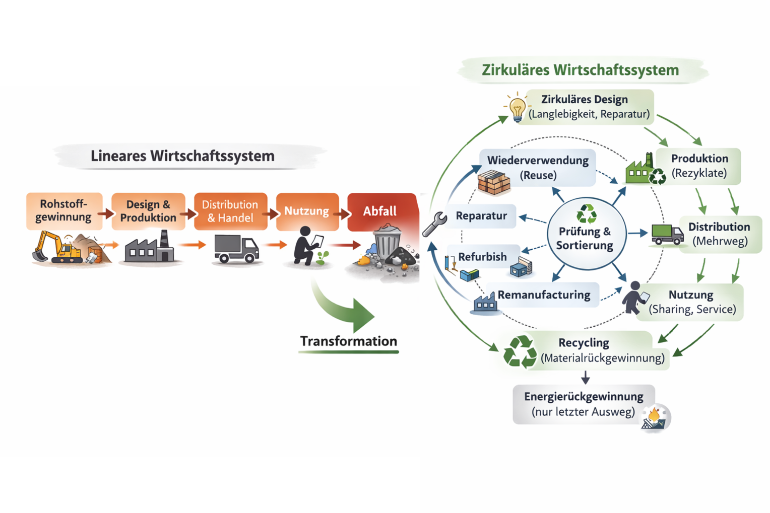 Die Kreislaufwirtschaft (zirkuläre Wirtschaft) hingegen setzt auf Wiederverwertung, Recycling und weitgehend geschlossene Stoffkreisläufe. Ziel ist es, Ressourcen möglichst lange im Umlauf zu halten und neue Rohstoffe einzusparen.